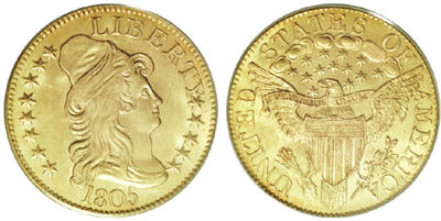 The 1804 half eagles are known with small 8 and small over large 8, the latter very rare in mint state. Coins of 1806 occur with either pointed-top or knob-top 6. The last date is 1807, known in three major varieties. The first shows a small date with small obverse and reverse stars; the second displays small date and large obverse and reverse stars. The last variety is the large date with large obverse and reverse stars.