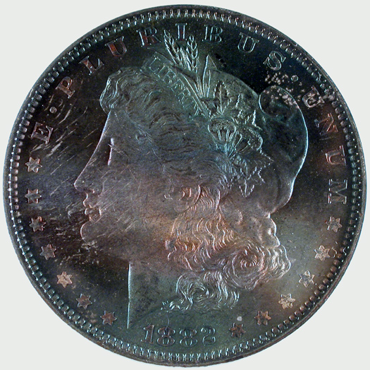 This 1882O is toned in spectacular shades of reds, greens and magenta. Excellent luster and a super clean cheek on liberty. PQ++