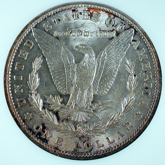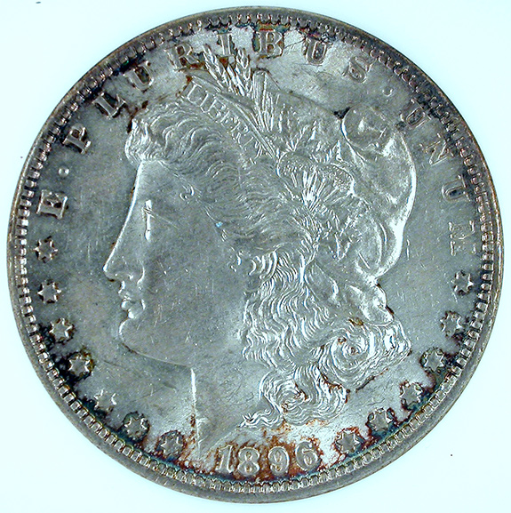 White and well struck with just a touch of color on the periphery. Very pleasing look.