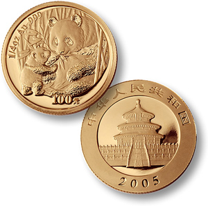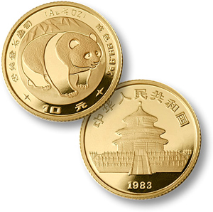 China issued its first gold coins picturing an adorable Panda design in 1982, in sizes of 1, 1/2, 1/4, and 1/10 troy oz. of 999 fine gold. Beginning in 1983 another size was added - 1/20 oz. Larger Panda coins were issued in some years, weighing 5 and 12 oz. These popular coins were issued in Prooflike Brilliant Uncirculated quality with a different design each year, through 2000. A freeze of the design was announced with the 2001 issues … and thus the 2002 Pandas were identical to 2001. But collectors spoke up in behalf of annual changes, and China has responded by reversing their policy, and announcing new designs for the 2003 Pandas. In addition, from 1986-1995 gold Panda Proof Sets were issued. Out of all the minted dates, the 1982 and 1983 trade for large premiums while all of the other dates trade as normal bullion coins.